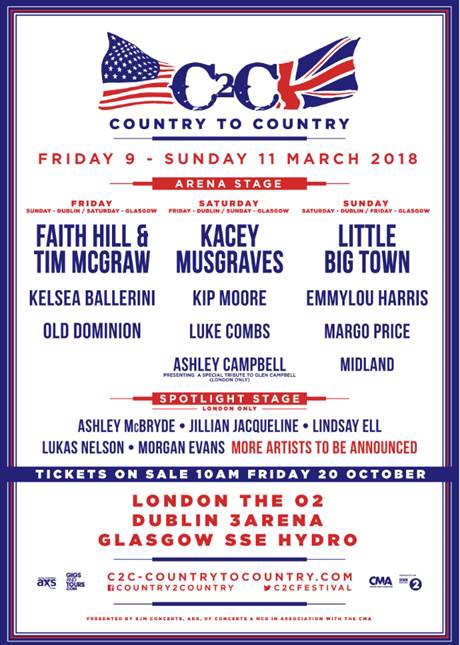 The day splits for C2C have now been announced alongside news that Morgan Evans and Ashley Campbell are confirmed to play the festival in London on 9 – 11th March 2018. Ashley will be performing and paying tribute to her father, the late Glen Campbell.